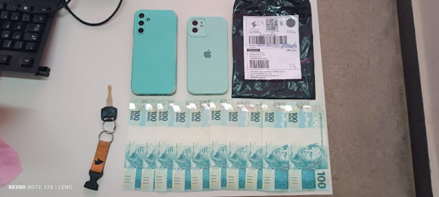 Durante a abordagem, foram encontradas com a dupla 10 cédulas falsas de R$ 100, totalizando R$ 1.000 em dinheiro ilícito. Além das cédulas, as autoridades apreenderam um iPhone 12, um celular Samsung A15 e a motocicleta CG FAN 150 START, que foi notificada e recolhida.
