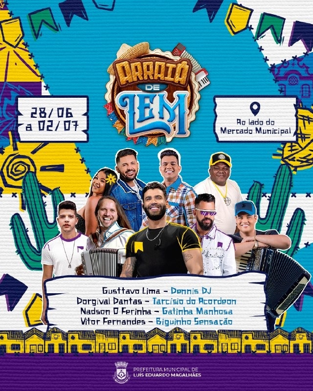 O maior São Pedro do Oeste da Bahia, o Arraiá de LEM, acontece de 28 de junho a 02 de julho, em Luís Eduardo Magalhães. O evento que será realizado na Avenida Tancredo Neves, no bairro Santa Cruz, em frente ao Mercado Municipal, vai reunir grandes nomes nacionais, como Gusttavo Lima, Dorgival Dantas, Tarcísio do Acordeon, Gatinha Manhosa, Nadson o Ferinha, Vitor Fernandes, Dennis DJ e Biguinho Sensação, nos cinco dias de festa, além dos artistas locais.