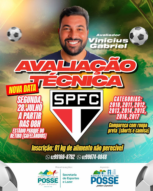 A Prefeitura de Posse, por meio da Secretaria de Esportes, confirmou uma nova data para a tão aguardada Avaliação Técnica do São Paulo Futebol Clube. O evento acontece na segunda-feira, 28 de julho, a partir das 08h, no Estádio Parque do Retiro, no bairro Cafelândios.
