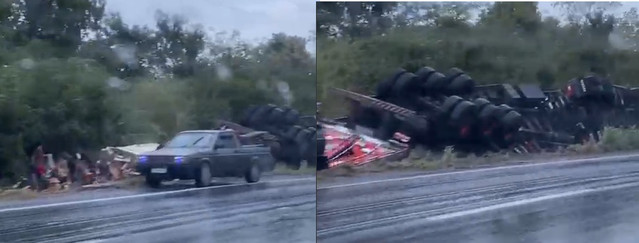 Uma carreta carregada de melões tombou na noite desta segunda-feira (28), por volta das 23h40, na BR-242, na região da Serra do Saco, em Barreiras, no Oeste da Bahia. O acidente aconteceu durante forte chuva, quando o motorista perdeu o controle da direção, saiu da pista e o veículo acabou tombando.