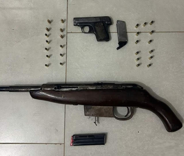 De imediato, os policiais deslocaram para o local informado a fim de averiguar, e ao chegarem, localizaram o suspeito que, ao ser interpelado, confirmou a veracidade da denúncia e informou ainda que tinha entregue suas armas de fogo a um terceiro para guarda. Em seguida, acompanhou as equipes até o local onde foi encontrada uma pessoa defronte um barraco, o qual confirmou as informações e entregou aos policiais duas armas de fogo sem registro, além de um saco contendo munições.
