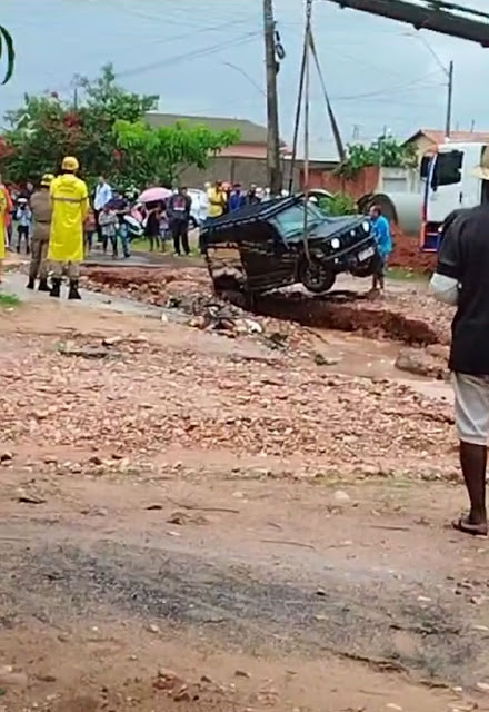 Um veículo foi engolido por uma cratera formada na Avenida JK, no setor Mãe Bela, em Posse, nordeste de Goiás, na última segunda-feira (18), devido às fortes chuvas que atingiram a cidade. A motorista conseguiu sair rapidamente do carro e não sofreu ferimentos.