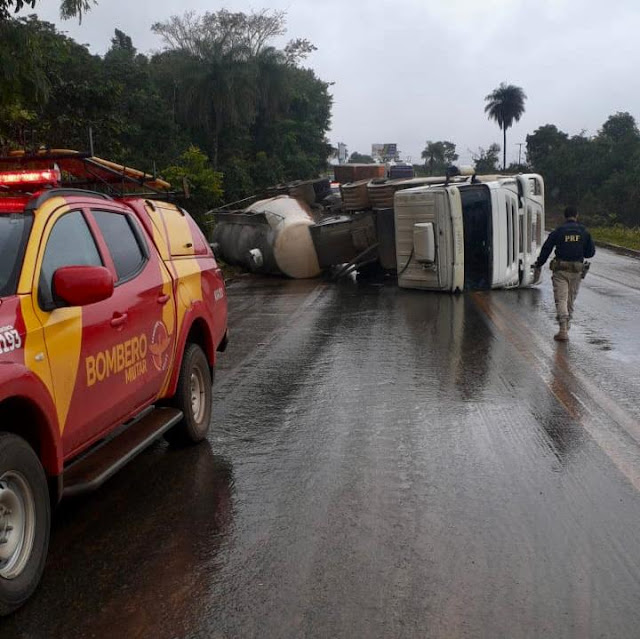 A Polícia Rodoviária Federal (PRF) assumiu a responsabilidade pela carreta e pela segurança na pista, enquanto os bombeiros atuaram no controle de riscos.