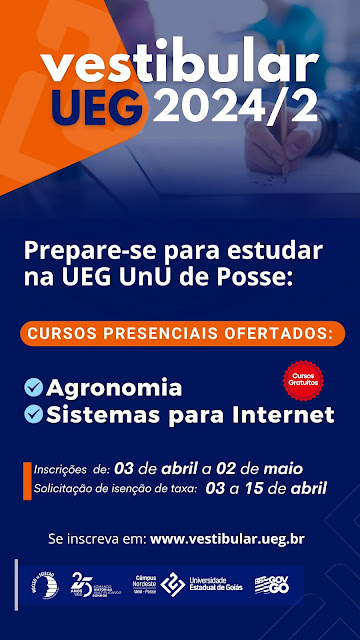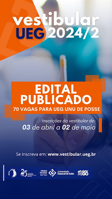 A Universidade Estadual de Goiás (UEG) deu início hoje, 3 de abril, ao período de inscrições para o Vestibular 2024/2. Os interessados têm até o dia 2 de maio para se inscreverem e concorrerem a uma das 730 vagas distribuídas em 23 cursos de graduação.