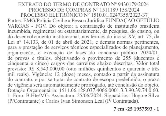 O extrato de termo de contrato entre a FGV e a Polícia Civil de MG foi publicado no Diário Oficial do Estado! Confira o documento na íntegra: