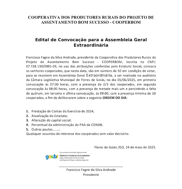A Cooperativa dos Produtores Rurais do Projeto de Assentamento Bom Sucesso (COOPERBOM), localizada em Flores de Goiás, convocou seus cooperados para uma Assembleia Geral Extraordinária, que acontecerá no próximo dia 5 de junho de 2025, no auditório da Câmara Legislativa Municipal.