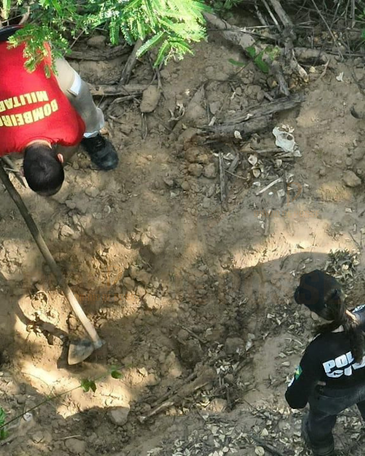Durante as buscas, foi encontrada a ossada de um cachorro, o que levantou suspeitas sobre o local. Após escavações, os agentes localizaram os corpos de um homem, uma mulher e uma criança, possivelmente a família procurada.