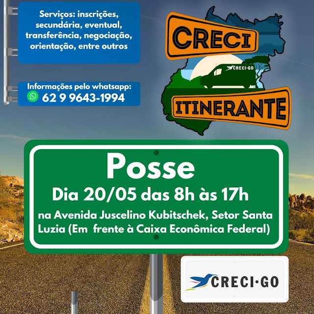 O projeto Creci Itinerante, do Conselho Regional dos Corretores de Imóveis de Goiás (CRECI-GO), estará na cidade de Posse no dia 20 de maio, oferecendo atendimento presencial aos profissionais da região. A unidade estará disponível das 8h às 17h, na Avenida Juscelino Kubitschek, Setor Santa Luzia, em frente à Caixa Econômica Federal.