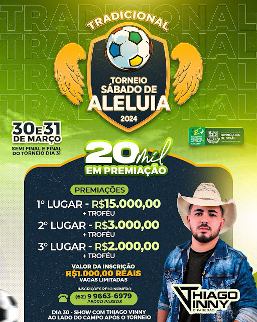 A Prefeitura Municipal de Divinópolis de Goiás, através da Secretaria de Esportes, realiza o tradicional Torneio de futebol de Sábado de Aleluia, no estádio Municipal Roserleide Pimentel.