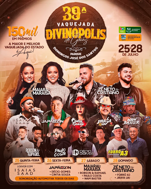 A Prefeitura de Divinópolis de Goiás, por meio da Secretaria Municipal de Cultura, divulga a programação oficial da 39ª Vaquejada do Município.