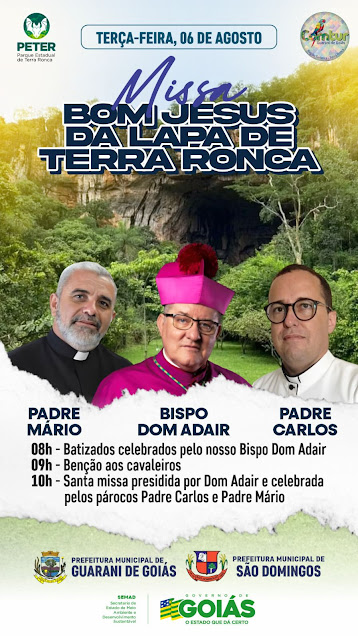 No dia 6 de agosto, será realizada a Missa Bom Jesus da Lapa de Terra Ronca, presidida pelo bispo Dom Adair e pelos padres Mário e Carlos.