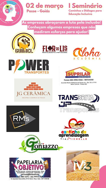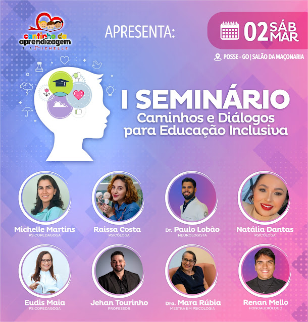 No dia 02 de Março acontecerá no salão da Maçonaria, o I Seminário Caminhos e Diálogos para Educação Inclusiva, este evento será realizado pelo Cantinho da Aprendizagem na pessoa da Tia Michelle e terá o objetivo de trazer informação e sanar dúvidas quanto a inclusão, tanto no âmbito familiar quanto escolar e social.