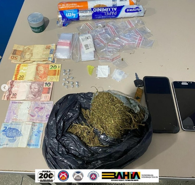 Na abordagem, foram encontradas diversas porções de drogas, além de materiais utilizados para o tráfico. O material apreendido incluiu: