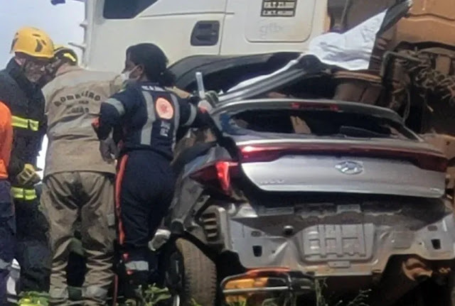 Com o impacto, o automóvel rodou na pista e acabou atingido pela segunda carreta que vinha logo atrás. A força da colisão causou o tombamento de uma das carretas, que estava carregada com cimento.