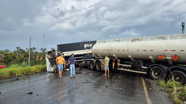 Um grave acidente envolvendo duas carretas na BR-020, em São Desidério, no oeste da Bahia, deixou pelo menos uma vítima fatal nesta segunda-feira (3). A batida aconteceu durante a chuva, e os veículos ficaram atravessados na pista, causando um engarrafamento de 8 km nos dois sentidos da rodovia. 🚗🚦