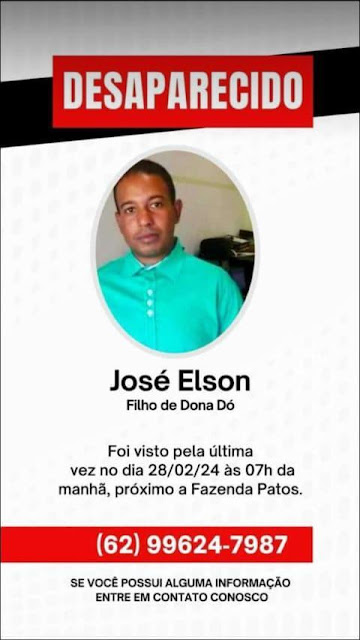 Desde o dia 28 de fevereiro de 2024, um morador de Nova Roma(GO), na região Nordeste Goiano, está desaparecido, o nome dele é José Elson, filho de Dona Dó.
