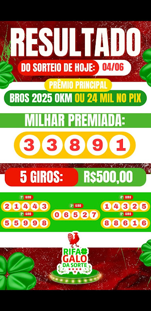 A sortuda da vez na Rifa Galo da Sorte foi a Luzivalda, moradora de Jaicós, no Piauí, que faturou o prêmio principal do sorteio realizado nesta terça-feira, dia 04/06. Com o bilhete de número 33891, ela garantiu a opção de levar uma Honda Bros 2025 zerinha ou R$ 24 mil via Pix 💸🏍️.