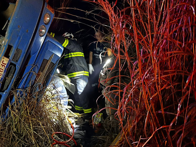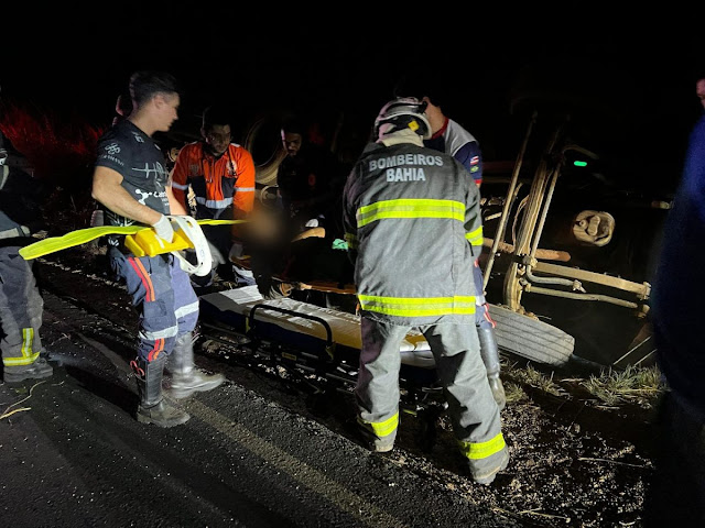 Um motorista de 46 anos ficou preso nas ferragens de uma carreta após o veículo tombar em um trecho da BA-459, na zona rural de Barreiras, Bahia. O acidente ocorreu por volta das 19h de terça-feira (13).