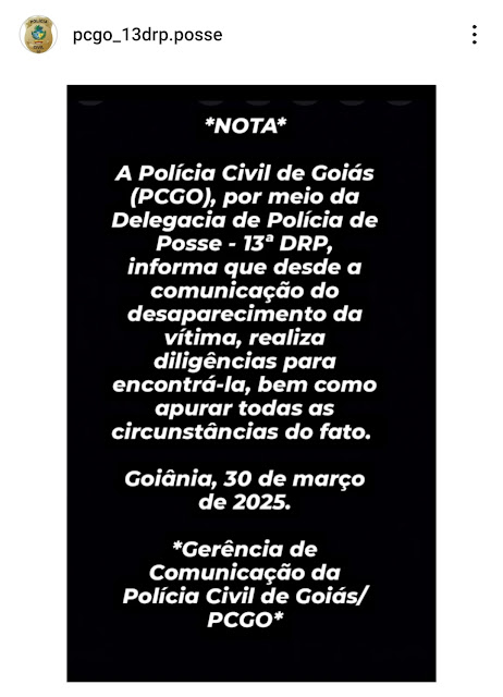Em nota, a Polícia Civil, por meio da Delegacia de Polícia de Posse – 13ª DRP, informou que está realizando diligências para localizar Vanessa e apurar as circunstâncias do caso. A corporação também reforçou a importância de a população colaborar com qualquer informação relevante.
