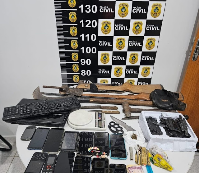 Nas buscas realizadas na residência, foram encontradas duas espingardas, 13 aparelhos celulares, um drone, um notebook, além de facas, um facão, um martelo, uma foice, drogas e cachimbos de crack. Um dos adultos envolvidos foi encontrado escondido debaixo de uma cama, junto a uma das armas de fogo.