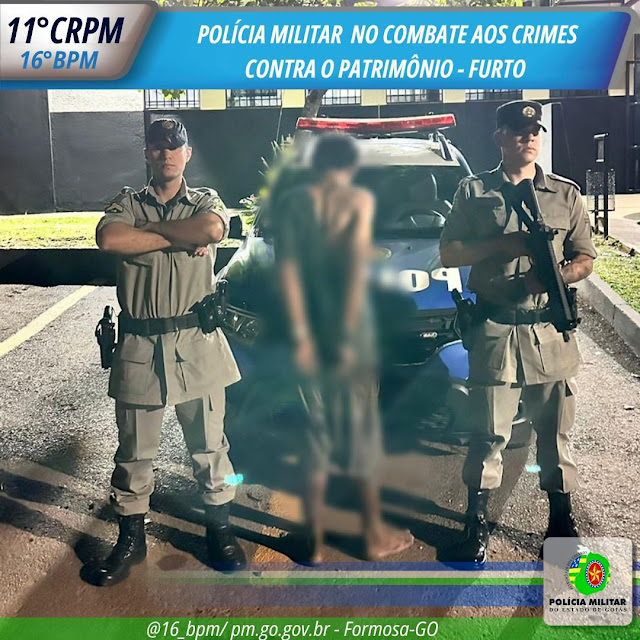 No dia 19 de outubro de 2024, a Polícia Militar de Goiás, por meio do 16º Batalhão em Formosa, conseguiu prender um indivíduo acusado de furto em um estabelecimento comercial. Após serem informados sobre o crime, policiais da Equipe Bravo atuaram rapidamente, recuperando diversos alimentos e duas bebidas alcoólicas que haviam sido subtraídos.