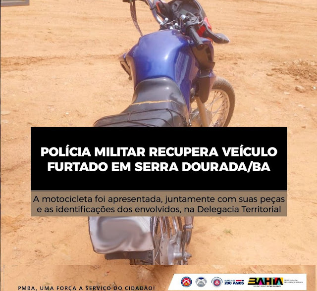 Na manhã desta segunda-feira (18), por volta das 11h, a Polícia Militar (PM) localizou e recuperou uma motocicleta Honda CG 160 Fan, cor azul, no Povoado de Traíras, município de Serra Dourada.