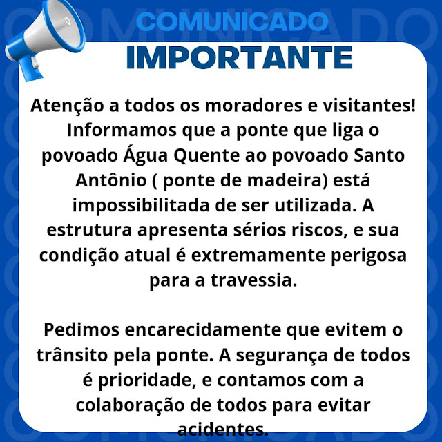O comunicado destaca que a ponte apresenta sérios riscos estruturais, tornando sua utilização insegura para veículos e pedestres. As autoridades locais solicitam que moradores e visitantes evitem atravessar a ponte até que uma avaliação completa e as devidas reparações sejam realizadas.