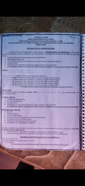 A Prefeitura de Posse, por meio da Secretaria Municipal de Educação, Cultura e Lazer, divulgou o cronograma de matrículas para o ano letivo de 2025 na Escola Municipal de Tempo Integral Dr. Joaquim Pereira da Costa Sobrinho. A renovação das matrículas para os alunos veteranos ocorrerá entre os dias 18 de novembro e 4 de dezembro de 2024.