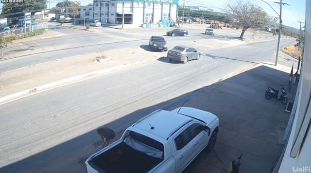 Na tarde desta segunda-feira, 21 de julho, um acidente de trânsito envolvendo uma motocicleta e um carro foi registrado na Avenida JK, em Posse (GO). As imagens de uma câmera de segurança mostram o momento da colisão.