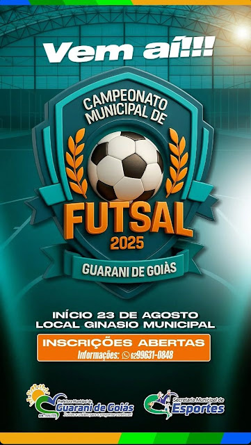 A bola vai rolar no Ginásio Municipal de Guarani de Goiás a partir do dia 23 de agosto, marcando o início do Campeonato Municipal de Futsal 2025. O evento promete agitar a cidade, reunindo equipes e torcidas em uma grande celebração do esporte. ⚽🔥