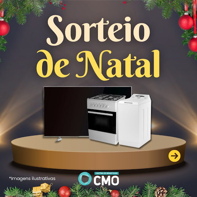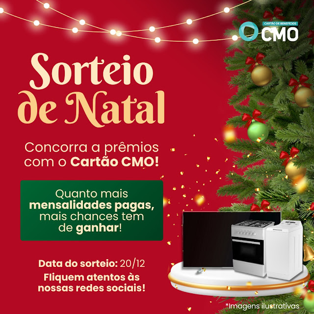 Neste fim de ano, o Cartão CMO está promovendo uma campanha de Natal para seus clientes, que poderão concorrer a prêmios especiais. Em um sorteio programado para o dia 20 de dezembro, os usuários do cartão terão a chance de ganhar uma televisão de 42 polegadas, uma máquina de lavar e um fogão, conforme mostram as imagens ilustrativas da promoção.
